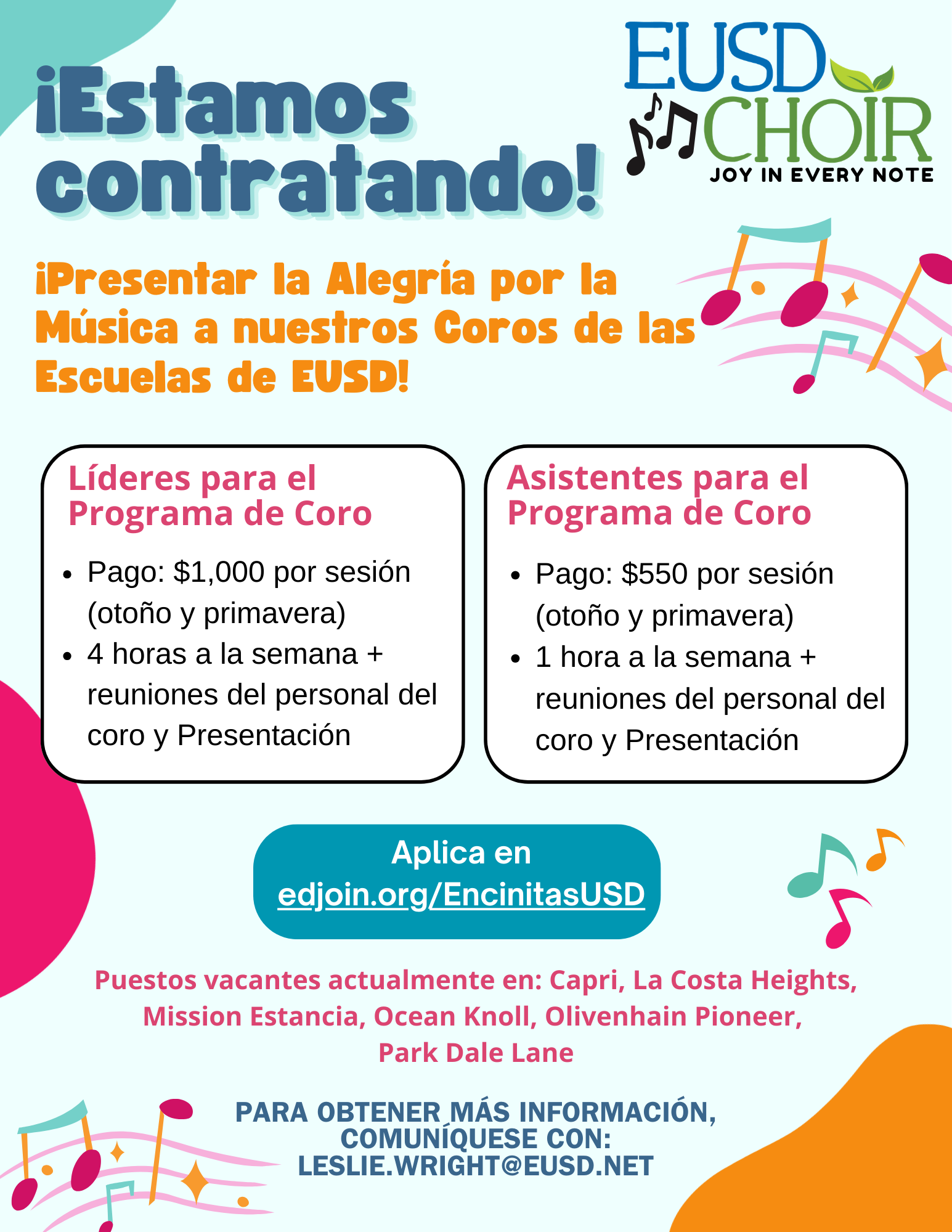 Puestos vacantes actualmente en: Capri, La Costa Heights, Mission Estancia, Ocean Knoll, Olivenhain Pioneer, Park Dale Lane. Para obtener más información, comuníquese con: leslie.wright@eusd.net